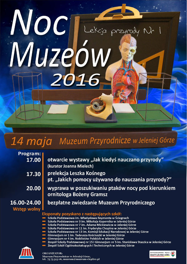 Muzeum Przyrodnicze w Jeleniej Górze (ul. Cieplicka 11a) zaprasza na Noc Muzeów, która odbędzie się 14 maja 2016 roku. W programie m.in. otwarcie wystawy "Jak kiedyś nauczano przyrody, prelekcja Leszka Kośnego, zatytułowana "Jakich pomocy używano do nauczania przyrody?" oraz wyprawa w poszukiwaniu ptaków nocy pod kierunkiem orniologa Bożeny Gramsz. Od godziny 16:00 bezpłatne zwiedzanie Muzeum Przyrodniczego.