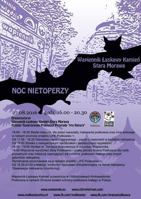 19:00 wręczenie wyróżnień Złoty Podkowiec i znaku jakości Kraina Podkowca dla osób prywatnych oraz instytucji zajmujących się ochroną podkowca małego oraz innych gatunków nietoperzy. Wyróżnienia przyznawane są w ramach projektu LIFE Podkowiec +.