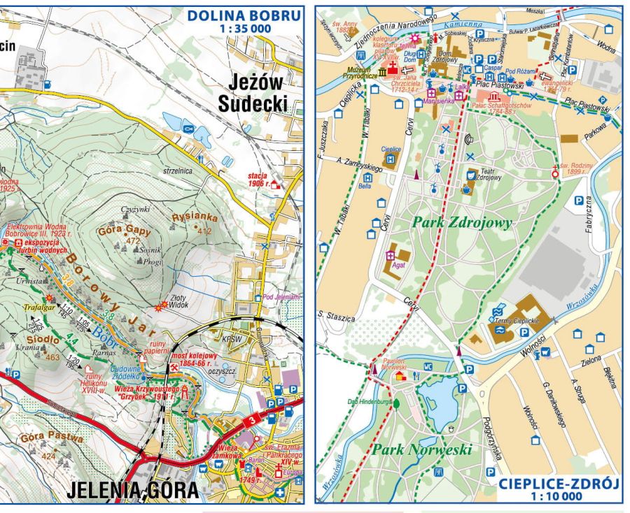 Mapa ma przyjazny dla odbiorcy rysunek i kolory, przez co jest czytelna i przyjemnie używa się jej w terenie. Szlaki podzielone są na odcinki i przy każdym znajduje się kilometraż oraz czas, jaki jest potrzebny na jego przejście. To spore ułatwienie, które doceniamy już na etapie planowania naszej wędrówki. Jeśli chodzi o treść turystyczną, jest ona zadowalająca i pozwala zaplanować nie tylko samą wędrówkę, ale też noclegi, czy wyżywienie na trasie. Trochę szkoda, że wydawnictwo nie postarało się o umieszczenie na mapie sklepów spożywczych, zwłaszcza w mniejszych miejscowościach… Co prawda, ikonka sklepu spożywczego jest w legendzie, ale już znaleźć jakąś na samej mapie jest niezwykle trudno.