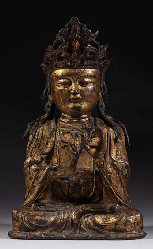 Główną postacią chińskiego panteonu buddyjskiego jest bodhisattwa Guanyin, czyli „ten, który się pochyla nad głosem”, którego niezliczone wizerunki wykonywano w Chinach do końca XIX w. Według źródeł ikonograficznych może on przyjąć 108 różnych przeistoczeń, by w najodpowiedniejszej formie dla czasu i miejsca uratować potrzebujących i obdarzyć ich pomyślnością. Anonimowy rzeźbiarz przedstawił bóstwo w tradycyjnej pozie medytacyjnej.