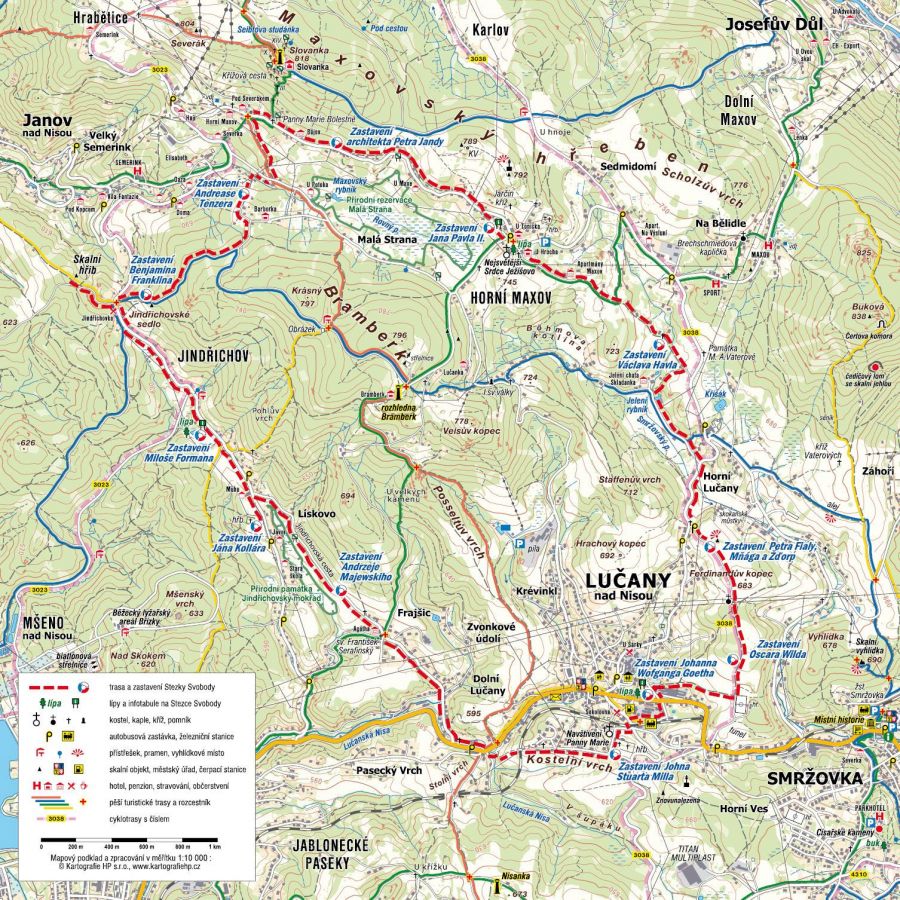 Inicjatorzy zainteresowali swym projektem ponad dwadzieścia różnych firm i organizacji, w tym lokalne samorządy, szkoły oraz indywidualnych sponsorów z bliższych i dalszych okolic. Prace, w których uczestniczyło ponad stu wolontariuszy rozpoczęto wiosną ubiegłego roku. Trasę szlaku oznakowano okręgami złożonymi z trzech pasków w kolorach czeskiej flagi: białym, niebieskim i czerwonym. Na trasie stworzono 12 przystanków oznaczonych kamiennymi słupami zwieńczonymi szklanymi sześcianami o krawędzi 25 cm, przypominającymi kostki lodu. Każdy słup owinięty jest paskiem blachy, na której wygrawerowano cytaty dotyczące wolności pochodzące z wypowiedzi dwunastu postaci ze świata filozofii, nauki i kultury: Benjamina Franklina, Oscara Wilde’a, Johanna Wolfganga Goethego, Johna Stuarta Milla, Jana Pawła II, Václava Havla, Miloša Formana, architekta Petra Jandy, muzyka Petra Fiali, słowackiego poety Jana Kollára, niemieckiego filozofa i pedagoga Andreasa Tenzera i polskiego aforysty Andrzeja Majewskiego. Słupy wykonano z materiałów nawiązujących do lokalnych tradycji: izerskiego granitu oraz szkła wytopionego w hucie należącej do średniej szkoły rzemiosła artystycznego w Železnym Brodzie.