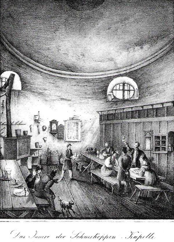 Kaplica św. Wawrzyńca na Śnieżce zamieniona na schronisko, C. Mattis, litografia kolorowana, ok. 1824-1850