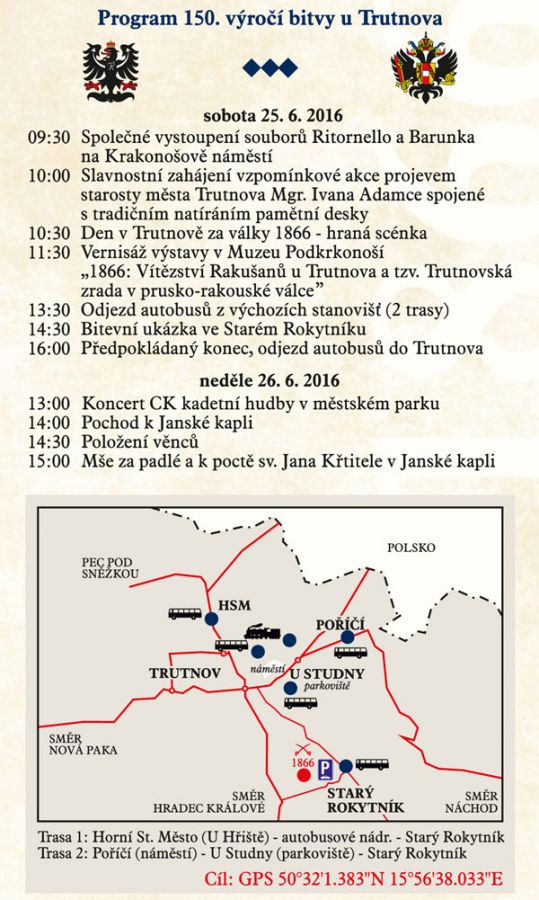 W tym roku mija okrągła rocznica bitwy pod Trutnovem. Rozegrała się w 1866 roku, a więc mija właśnie 150 lat od starcia armii pruskiej z austriacką. Jeśli mieliście przyjemność podróżowania i zwiedzania okolicy, to z pewnością natknęliście się na jakiś pomnik, czy tablicę informacyjną, które upamiętniały bitwę. Miasto Trutnov planuje, że obchody rocznicy będą w tym roku dwudniowe i przygotowało wiele atrakcji, między innymi inscenizację bitwy, scenki historyczne, a także wystawy o tematyce wojskowej.