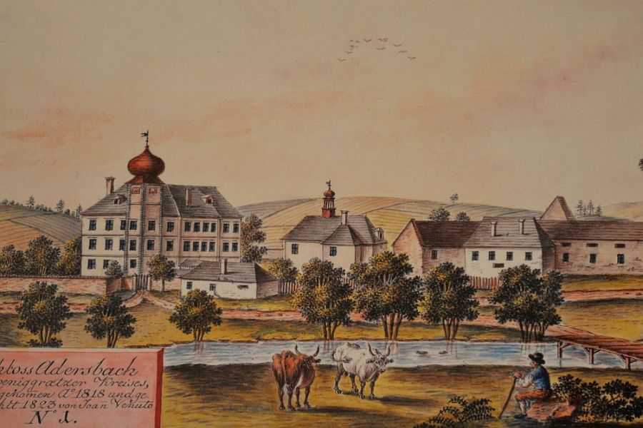 Adršpašski pałac, wzniesiony w dolnej części wsi zwanej Dolnym Adršpachem, przez stulecia był siedzibą właścicieli tutejszego majątku. Pierwotnie w tym miejscu znajdował się warowny dwór jednego z najstarszych czeskich rodów, Berków z Duby, którzy w XIV wieku przenieśli tu swą siedzibę z gotyckiego zamku (hradu) leżącego na Starozameckim vrchu, powyżej miejscowości.