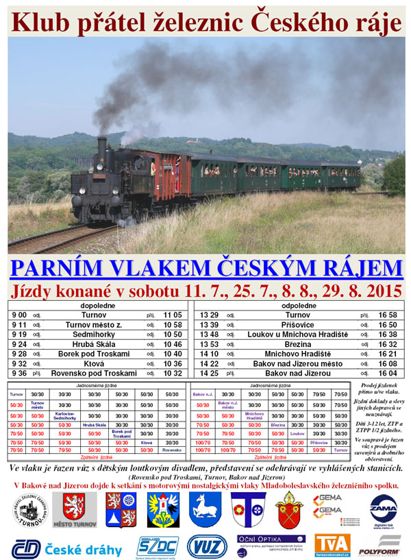 Klub Przyjaciół Kolei Czeskiego Raju organizuje wiele ciekawych imprez kolejowych, na które warto się wybrać. Jedną ze sztandarowych jest „Parowozem przez Czeski Raj”, która w tym roku odbędzie się kilka razy (25 lipca, 8 sierpnia, 29 sierpnia). Polecamy i zapraszamy!