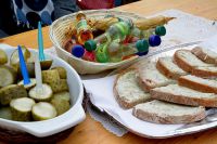 - kromka chleba ze smalcem, ogórek oraz piwo (na łodzi)