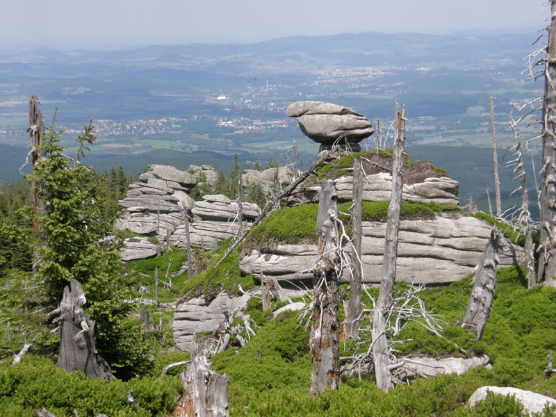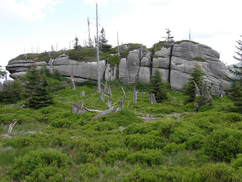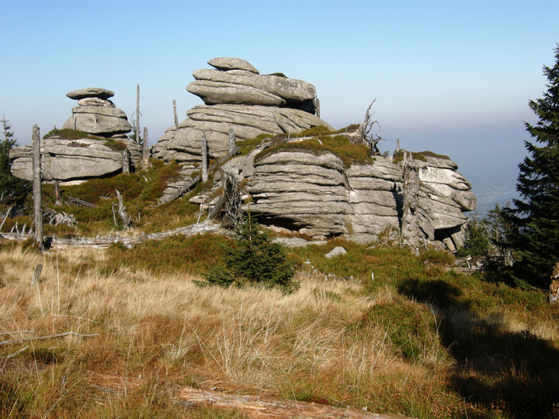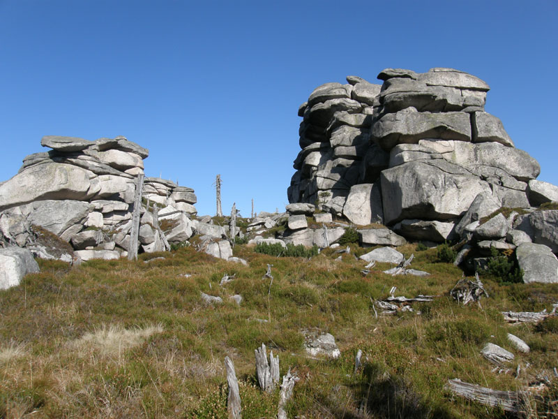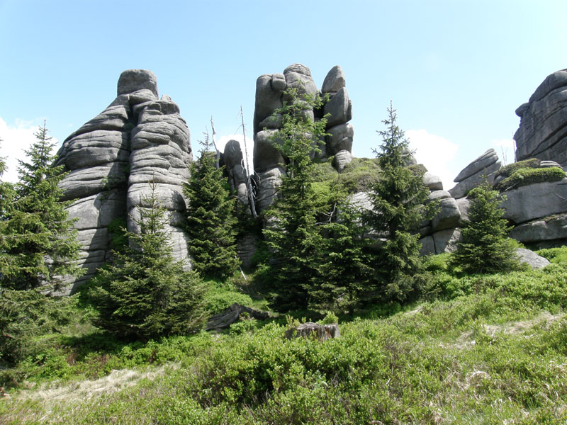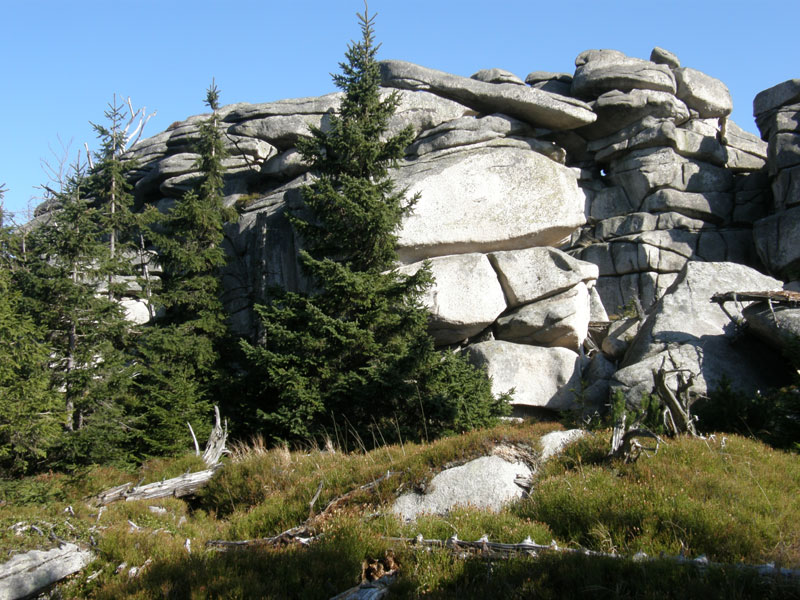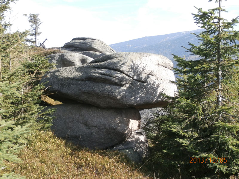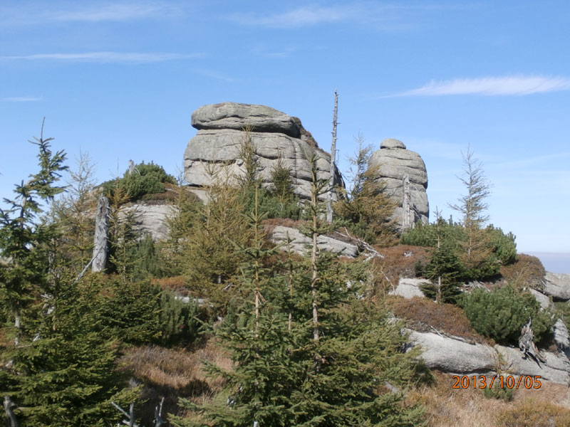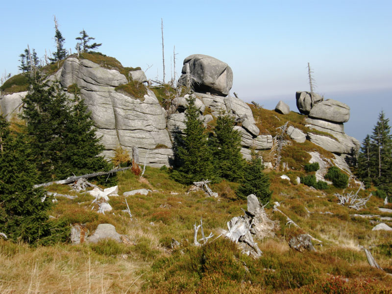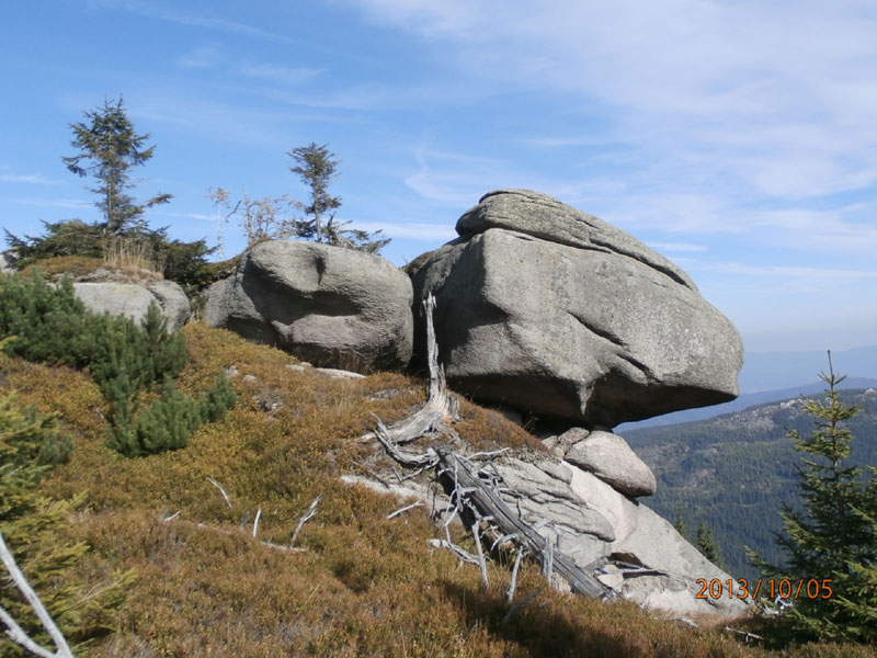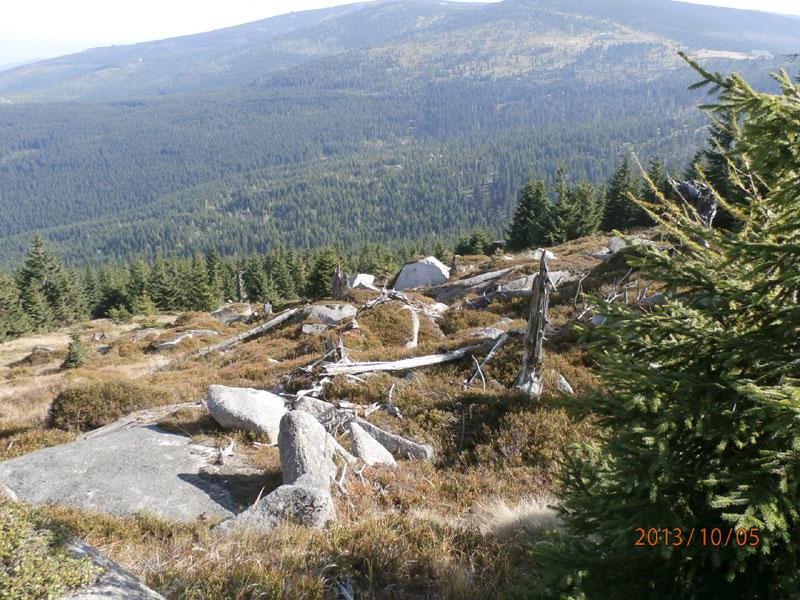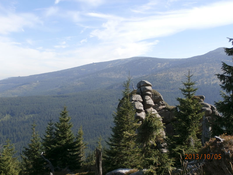 Karkonoszowe Skały spod Wyszogórki na tle Smogornii, Tępego Szczytu i Małego Szyszaku, oraz Suchej Przełęczy
