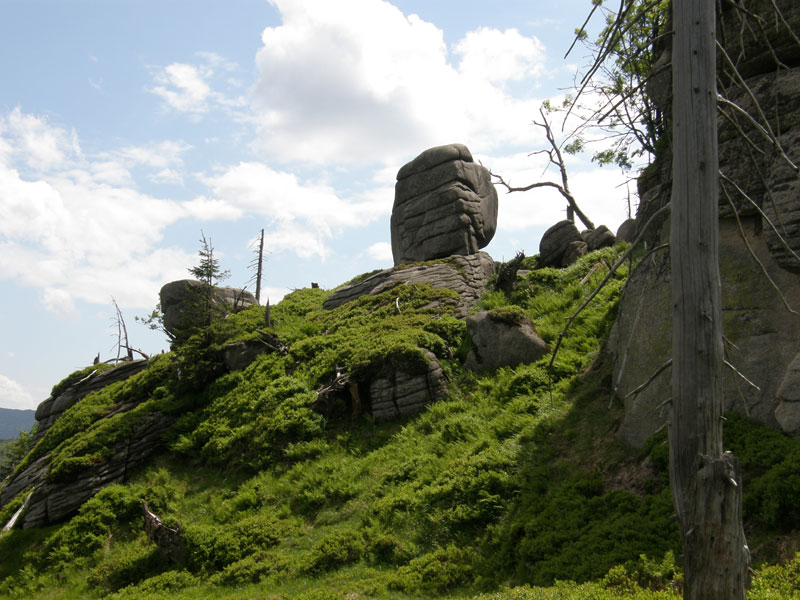44A. WIELKIE RUMOWISKO – Granitowe blokowisko na wsch. zboczu Hutniczego Grzbietu pomiędzy Ścieżką nad Reglami a Foczka. Dzisiaj znacznie mniejsze: od Rudnicy po Krajny Dukt o szer. ok. 200 m przy dług. prostopadłej do zbocza ok. 150 m. Od pn. i płd. wyraźnie zarastające. www.jezewski.ostrowiec.pttk.pl Marzena Stępień-Sałek Łysogóry i siedlisko czarownic: Równie ważną, chyba najbardziej znaną osobliwością geologiczną Łysogór są podszczytowe rumowiska skalne, zwane gołoborzami. Powstały one w czasie czwartorzędowych zlodowaceń, w chłodnym klimacie plejstocenu, wskutek rozpadu starych kambryjskich piaskowców kwarcytycznych, budujących wysoką niedgyś grań świętokrzyską. Zestawiony petronim o motywacji topograficznej z funkcją określającą.