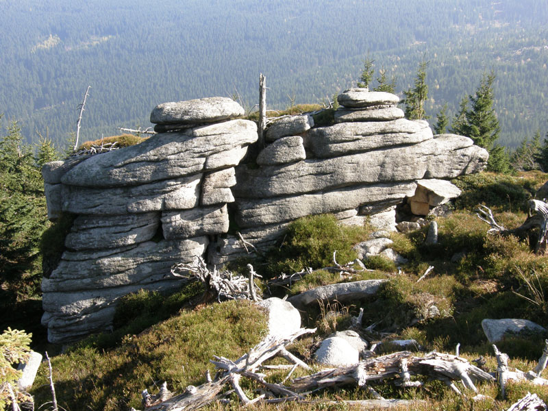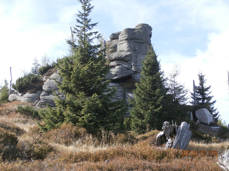 71. KARKONOSZOWE SKAŁY – Skały usytuowane na NE od Wysoczyńca, poniżej załomu stoku w NW górnej części Kozackiej Doliny. Kształtem przypominaja postać ludzką ciągnącą wór chrustu w towarzystwie niedżwiedzia. Dotychczas nie dowiedziono czy Karkonosze pochodzą od nazwy osobowej Karkonosz, czy raczej jest to nazwa ponowiona z makrooronimu Karkonosze. W czeskich a potem w niemieckich ludowych podaniach Karkonosz występował początkowo jako diabeł a potem jako duch gór (rex montanus). Nazwa osobowa o charakterze przezwiskowym: mający nos jak pień lub Krzywonos. Stąd adaptacja fonetyczna z czeskiego. Zestawiony petronim z członem odosobowym. www.helas.cz Restauracja Helena: polecamy następujące specjały: zupa czosnkowa z szynką i serem. Karkonoszowy kociołek, karkonoskie specjaly, specjały z danielego mięsa... Zestawiony petronim o charakterze mieszanym: osobowo – topograficznym.