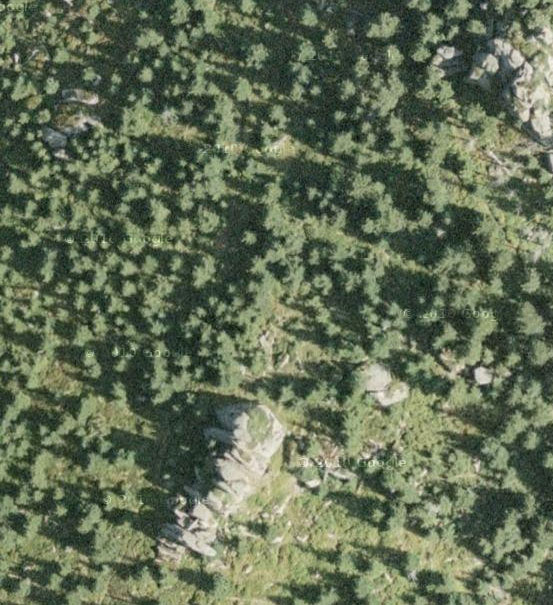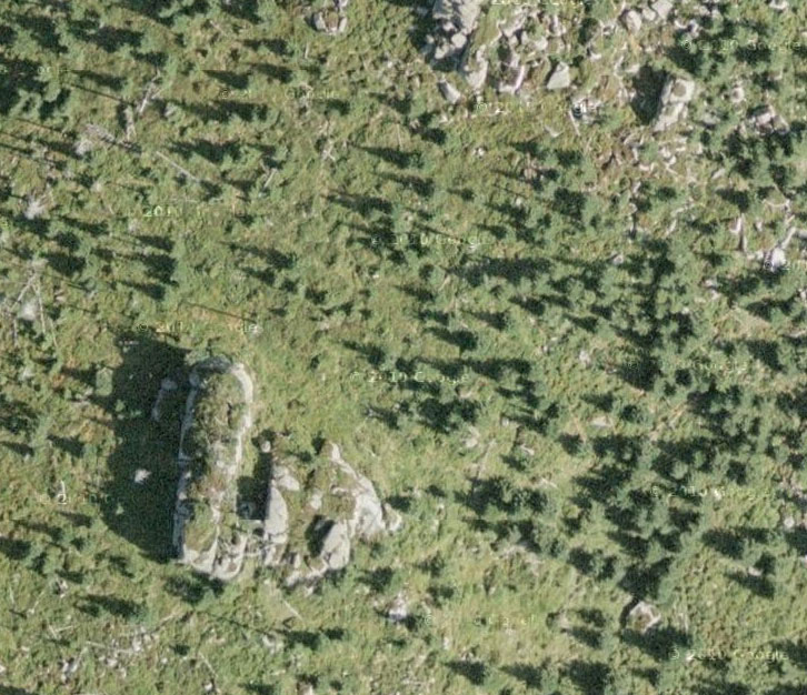 Na ramce pn. widoczna płd. część Strzyg (Skorpiona) a na wsch. Hymel i Połomna. Między Skorpionem i Obłą Opoką (w całośći tylko na zdjęciu satelitarnym!) jest Puste Siodło. Na Wyszogórce ciąg skalny Wysoczyńca a po zach. stronie niższy Ptasiniec na którego pn. krańcu widać Wartownię. Pod Wysoczyńcem od zach. Karkonoszowe Skały a na płd. od nich Pudelek, Wywrotka, Jagniątki i Cietrzewie