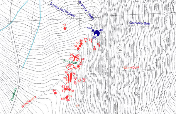 53. SKRYTE – Niewysokie skały w postaci dwóch nałożonych na siebie płyt na wys. 1150 m w odległ. ok. 60 m na NW od Pyszałka i 30 m na zach. od Nagórnego Duktu. Od skał w kierunku pn. ciągnie się pas gruzu i rumoszu aż po Ścieżkę nad Reglami. Nazwa z przedrostkiem –s od kryć, co z psł. †kry-ti – kładąc coś na coś zasłaniać, czynić niewidocznym. Skała jest niewidoczna ponieważ zasłania ją las.