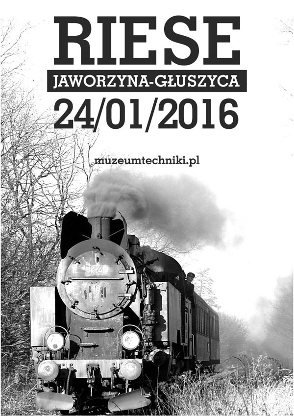 W niedzielę, 24 stycznia 2016 roku, zapraszamy do udziału w inaugurującym sezon przejeździe muzealnym pociągiem specjalnym „Riese”, na trasie Jaworzyna Śląska – Głuszyca – Jaworzyna Śląska. Wyprawa pociągiem „Riese” to nie tylko przejazd w zabytkowych (pochodzących z 1928 r.) wagonach prowadzonych przez lokomotywę parową TKt48-18, ale także możliwość zmierzenia się z jedną największych tajemnic Dolnego Śląska – kompleksem RIESE w Głuszycy.