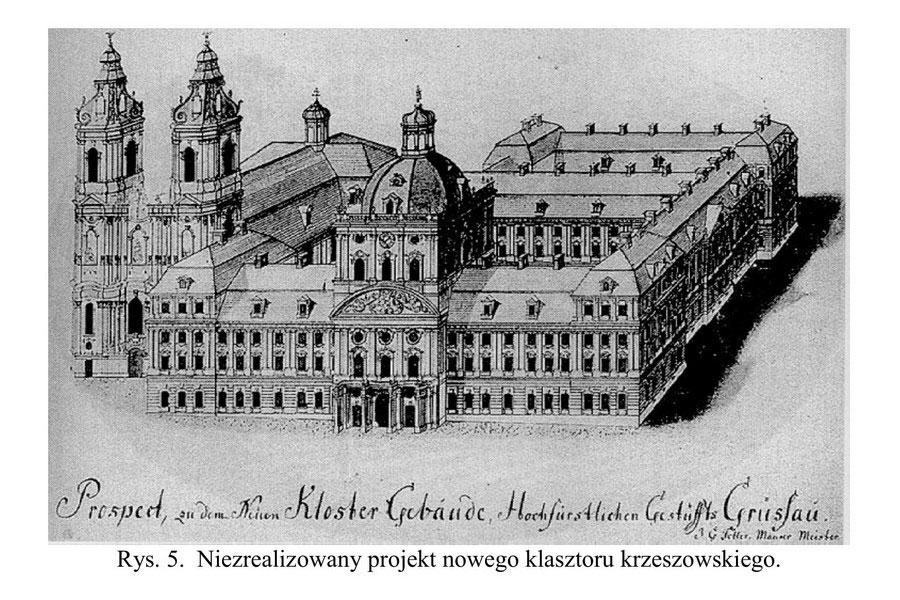 Pod koniec XVII i w XVIII wieku obiekty klasztorne w Krzeszowie były przebudowywane i wznoszono nowe. Powstać miało wtedy całe nowe skrzydło klasztoru, zachodnie. Jego projekt znajduje się na dwóch zdjęciach. Jedno z nich przedstawia samo skrzydło. Fotografię tę można zobaczyć w domu opata. Na drugim jest rysunek całego klasztoru - skrzydło zachodnie miało być istotnym elementem projektowanej budowli. Do jego budowy nie doszło ze względu na epidemię tyfusu w roku 1758 i restrykcje - co było głównym powodem - władz pruskich. Na opactwo bowiem nakładane były coraz większe podatki, które w latach 1787-97 wyniosły aż 80% dochodów opactwa. W tym czasie zostały zakazane pielgrzymki. Plany rozbudowy ostatecznie zostały przekreślone poprzez sekularyzację zakonu na początku XIX wieku.