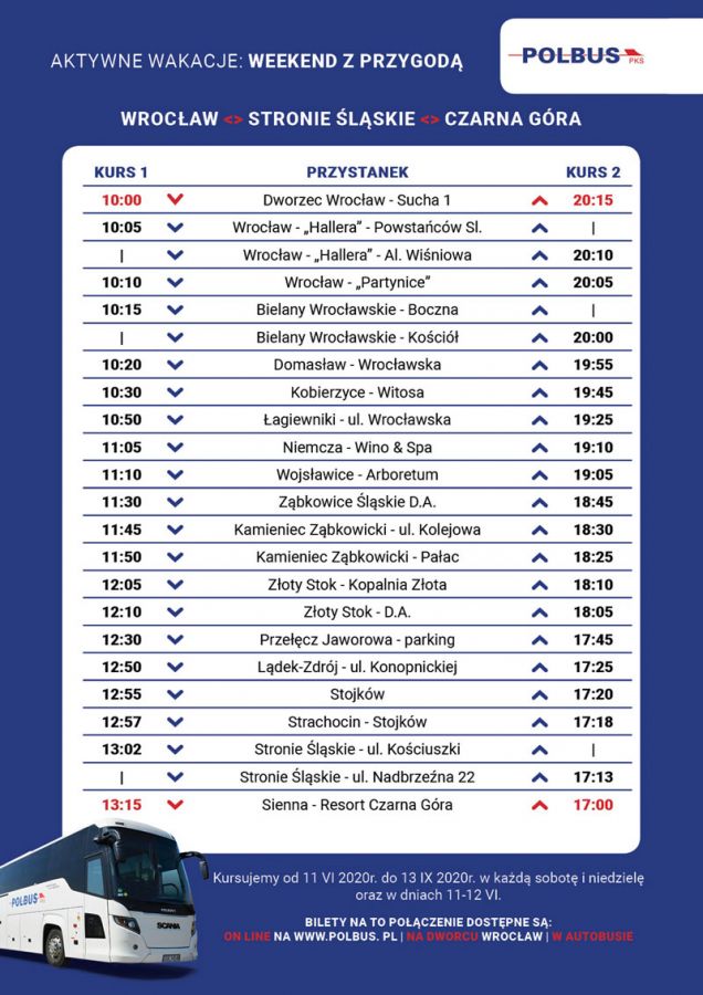 Warto również wspomnieć o innych, wakacyjnych ofertach firmy POLBUS. W tych samych terminach, co dwa powyższe połączenia, pojedziemy także do Kudowy-Zdroju. Start z Wrocławia o godz. 8:00, na miejscu będziemy o godz. 11:15. Po drodze z ciekawszych przystanków warto wspomnieć o Bardzie, które do tej pory było notorycznie pomijane w ofertach przewoźników. Z pewnością wartym zauważenia novum jest kurs na granicę do Kudowy-Słonego! Od dłuższego czasu możemy również skorzystać z połączenia z Wrocławia do Karpacza. To również połączenie weekendowe, ale niektóre autobusy kursują już w piątek. Trasa prowadzi standardowo najwygodniejszą trasą przez Jelenią Górę i dalej Mysłakowice, Kowary i Ściegny aż do Karpacza Górnego. Na koniec coś niesudeckiego, ale również atrakcyjnego pod względem turystycznym. Wcześnie rano (5:15) możemy ruszyć z Wrocławia do Energylandii w Zatorze, spędzić tam cały dzień i wieczorem wrócić do stolicy Dolnego Śląska. Oferta dostępna tylko w miesiącach wakacyjnych.