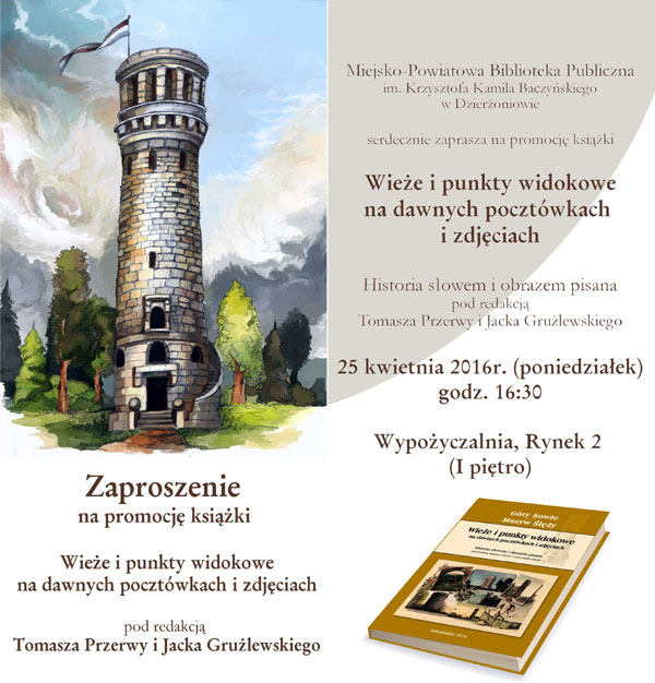 Miejsko-Powiatowa Biblioteka Publiczna im. Krzysztofa Kamila Baczyńskiego w Dzierżoniowie zaprasza na promocję książki „Wieże i punkty widokowe na dawnych pocztówkach i zdjęciach”. Spotkanie z autorami książki, Tomaszem Przerwą i Jackiem Grużlewskim odbędzie się 25 kwietnia 2016 r., o godzinie 16:30, w siedzibie Biblioteki, Rynek 2 (I piętro)