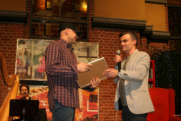 Po krótkim przywitaniu i wręczeniu pamiątkowych rycin, dla wszystkich którzy pojawili się na zdjęciach, można było podziwiać duże, wielkoformatowe ryciny. W trakcie oglądania była możliwość posłuchania zespołu, który umilał czas widzom, a także porozmawiać z autorem wystawy. Jak podkreślał Konrad Imiela, wystawy które obywają się w galeriach cechuje to, że trzeba kupować bilety, natomiast tutaj można przyjść za darmo i to nawet wielokrotnie. Można również przysiąść na moment, napić się kawy i oddać kontemplacji sztuki. Ideą wystawy jest to, że proscenium to część sceny teatralnej znajdująca się przed kurtyną. Tutaj przedscenie jest chodnikiem, a kurtyna – drzwiami wejściowymi, otwierającymi się dzięki fotokomórce. Wystawę będzie można podziwiać do 25 stycznia 2017 roku.