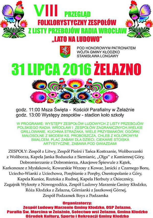 W najbliższą niedzielę, 31 lipca 2016 r., o godz. 13:00 rozpocznie się VIII Przegląd Folklorystyczny Zespołów z Listy Przebojów Radia Wrocław. Popularny wśród miłośników folkloru program wychodzi z eteru, dzięki czemu na stadionie sportowym w Żelaźnie będzie można posłuchać najlepszych folkowych kapel.