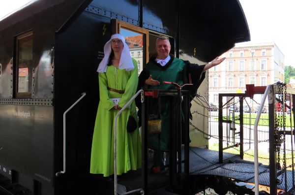 Zapraszamy wszystkich pasażerów Weekendowych Pociągów Muzealnych do bezpłatnego zwiedzania Świdnicy w towarzystwie przewodnika przebranego w dawny strój kupiecki. W każdą niedzielę od czerwca do sierpnia po przyjeździe o godz. 10:38 porannego pociągu „Czerwony Baron”, na peronie świdnickiego dworca będzie czekał ubrany w dawny strój kupiecki przewodnik, który zaprosi wycieczkowiczów na blisko dwugodzinny spacer po najciekawszych zakątkach miasta i opowie o jego niezwykłej historii. Oprowadzaniem zajmować się będą na zmianę dwaj przewodnicy sudeccy - Mariusz Wojciechowski oraz Tomasz Śnieżek.