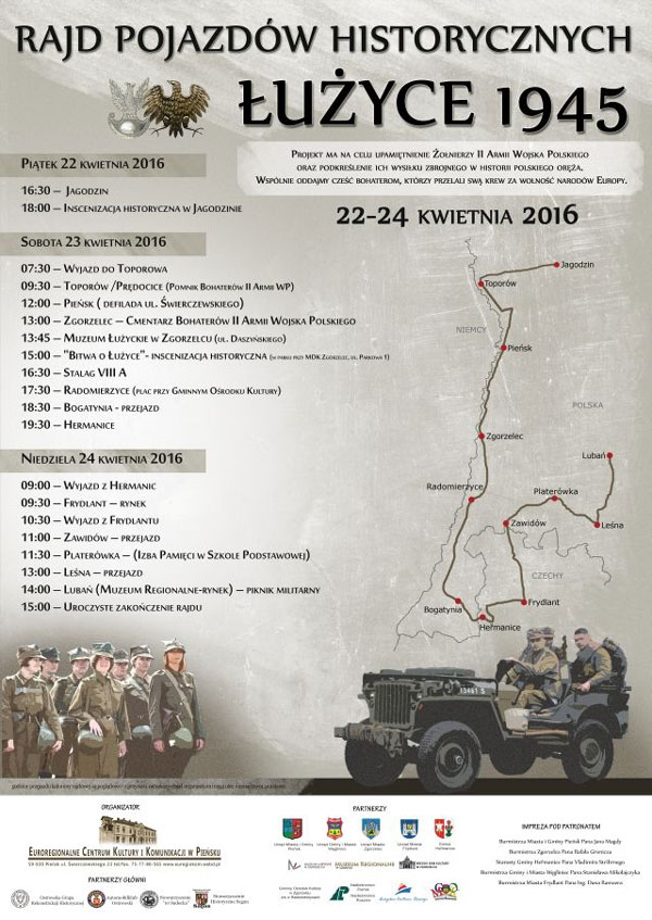 W dniach 22-24 kwietnia br. zachęcamy do udziału w Rajdzie Pojazdów Historycznych "ŁUŻYCE 1945". Będzie to swoista podróż w czasie do drugiej połowy kwietnia 1945 roku, kiedy to trwały krwawe walki za Nysą Łużycką. Projekt ma na celu upamiętnienie żołnierzy II Armii Wojska Polskiego walczących na Łużycach oraz podkreślenie ich wysiłku zbrojnego w historii polskiego oręża. W trzydniowej imprezie weźmie udział ok. 100 rekonstruktorów i do 20. pojazdów historycznych.