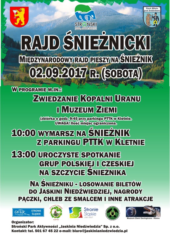 Stroński Park Aktywności "Jaskinia Niedźwiedzia zaprasza na Rajd Śnieżnicki (Międzynarodowy Rajd Pieszy na Śnieżnik), który odbędzie się w sobotę, 2 września 2017 roku. W programie m.in. zwiedzanie Muzeum Ziemi oraz Kopalni Uranu, a na szczycie spotkanie grup polskiej i czeskiej. Na Śnieżniku losowanie biletów do Jaskini Niedźwiedziej, upominków, a także pączki, chleb ze smalcem i inne atrakcje...