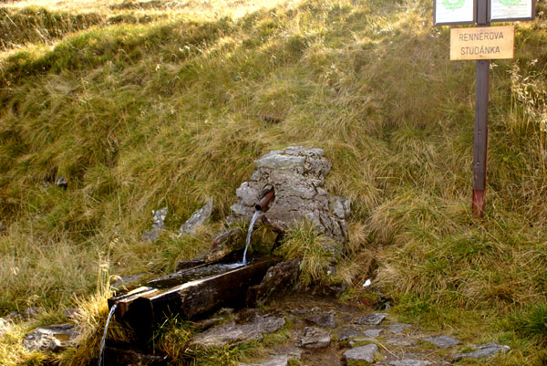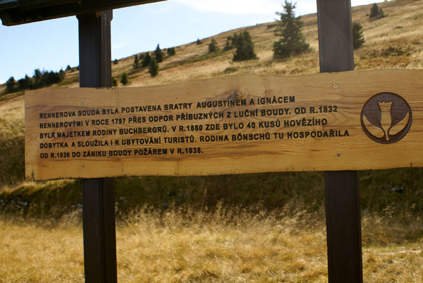 Rennerova bouda (Rennerovka) została zbudowana w 1797 roku jako letnie schronienie dla wypasanego na okolicznych łąkach bydła. Jej budowie, dokonanej przez braci Ignaza i Augustina ze Špindlerovego Mlýna, przeciwni byli właściciele pobliskiej Lučnej boudy, będący zresztą krewnymi obu braci, ale ich protesty na niewiele się zdały. Niemniej jednak sytuacja wyglądała groźnie, bo przeciwnicy braci rozpętali swoistą wojnę, w czasie której, jak wspominają kroniki, dwa razy zniszczyli drewno zwiezione na budowę, a jednego z Rennerów, pilnującego w nocy budowy, wrzucili do dołu z niegaszonym wapnem. Chcieli jeszcze zrzucić na niego potężny kamień, ale głaz wymknął im się z rąk i spadł na nogę jednego z napastników. Ten wrzeszcząc w niebogłosy, odwrócił uwagę innych, którzy pospieszyli mu na pomoc, a w tym czasie Renner zdołał wydostać się z dołu i zbiegł do chaty w dolinie Białej Łaby, gdzie szybka kąpiel w zimnej wodzie uchroniła go przed poparzeniami. Wojna skończyła się interwencją władz, które zabrały część łąk użytkowanych przez gospodarzy z Lučnej boudy i przekazała je w użytkowanie braciom Rennerom.