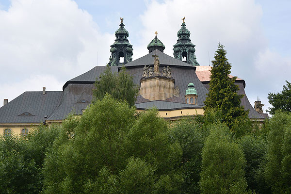 Tym razem w naszych fotograficznych wędrówkach zapędziliśmy się w rejon Kotliny Kamiennogórskiej, a dokładniej oczywiście do Krzeszowa. Konkursowe zdjęcie przedstawiało widok na bazylikę Wniebowzięcia Najświętszej Marii Panny, ale jak gdyby od zaplecza – zrobione zostało z dróżki biegnącej wzdłuż klasztornego ogrodzenia.