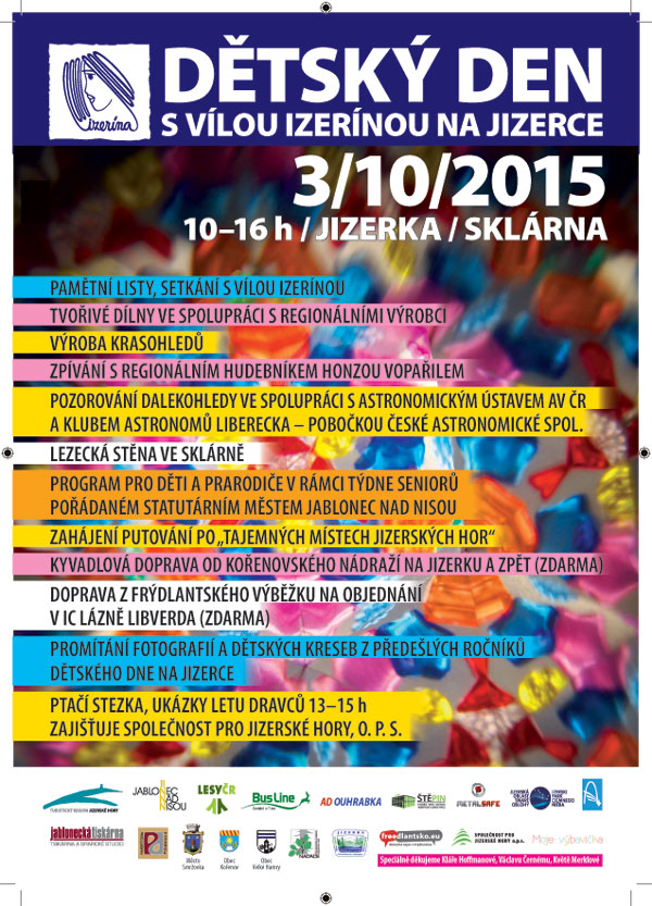 3 października od godziny 10:00 zapraszamy do Jizerki, na spotkanie z Rusałką Izeriną, opiekunką Gór Izerskich. Organizatorzy przygotowali szereg atrakcji, nie tylko dla najmłodszych, m.in. spotkania z Izeriną, pokazy lotów drapieżników, wystawy, gry i zabawy, dalekie obserwacje we współpracy z Czeskim Stowarzyszeniem Astronomicznym, wiele dobrej muzyki. Z Kořenova będzie kursowała wahadłowo komunikacja autobusowa...