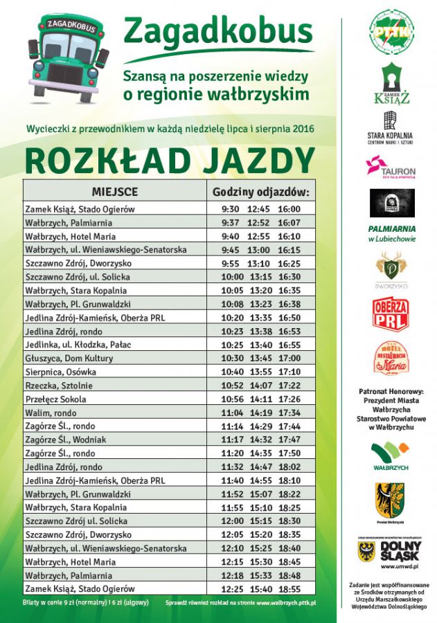 Bilet będzie ważny cały dzień, czyli będzie można wsiąść np: w Jedlinie, obejrzeć pałac Jedlinka, a potem następnym Zagadkobusem pojechać dalej lub wrócić do Wałbrzycha. Dzięki Zagadkobusowi, wspólnej inicjatywie gmin i instytucji turystycznych, w ciągu jednego dnia można zwiedzić kilka atrakcji turystycznych, a jednocześnie nie martwić się o transport, bo będzie on kursował kilka razy dziennie.