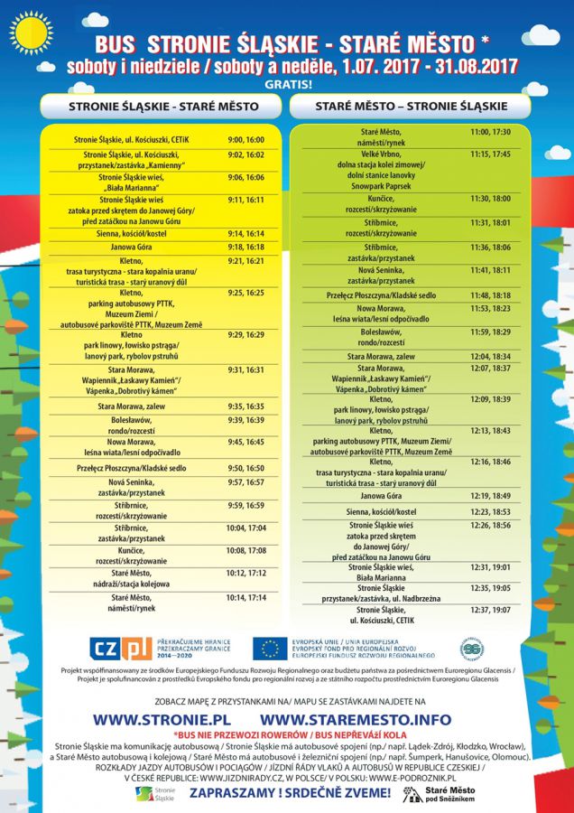 Mamy świetną wiadomość dla turystów udających się na szlaki wiodące po Masywie Śnieżnika. Na trasie STRONIE ŚLĄSKIE - STARÉ MĚSTO uruchomiono bezpłatne weekendowe połączenia busowe.