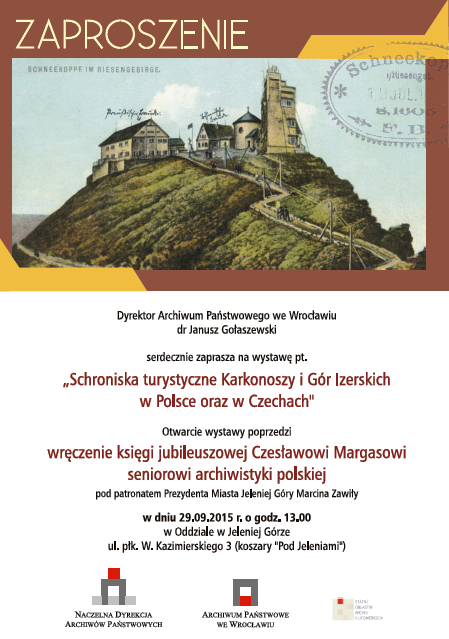 Archiwum Państwowe w Jeleniej Górze serdecznie zaprasza na otwarcie czesko-polskiej wystawy o schroniskach w Karkonoszach i w Górach Izerskich oraz na jubileusz 90-lecia Czesława Margasa - długoletniego dyrektora Archiwum Państwowego w Jeleniej Górze, połączony z wręczeniem mu księgi jubileuszowej. Impreza odbędzie się 29 września 2015 r. (wtorek), początek o godz. 13:00. W Jeleniej Górze, ul. płk. Kazimierskiego 3 (teren koszar "Pod Jeleniami".