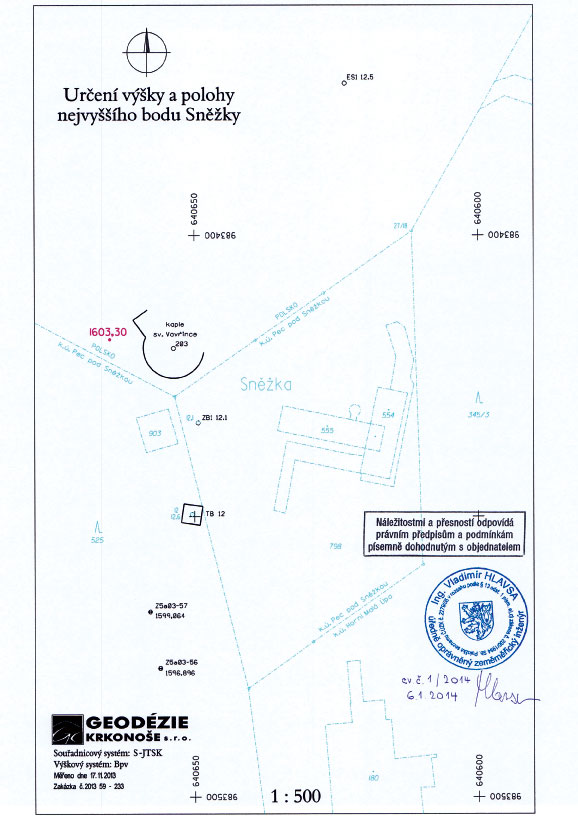 Na podstawie pomiarów geodety Vladimíra Hlavsa z Geodézie Krkonoše, s. r. o., najwyższy szczyt Karkonoszy, ale jednocześnie także Sudetów i Republiki Czeskiej, jest wyższy niż przedstawia się to na mapach turystycznych, bo mierzy sobie 1603,3 m npm.