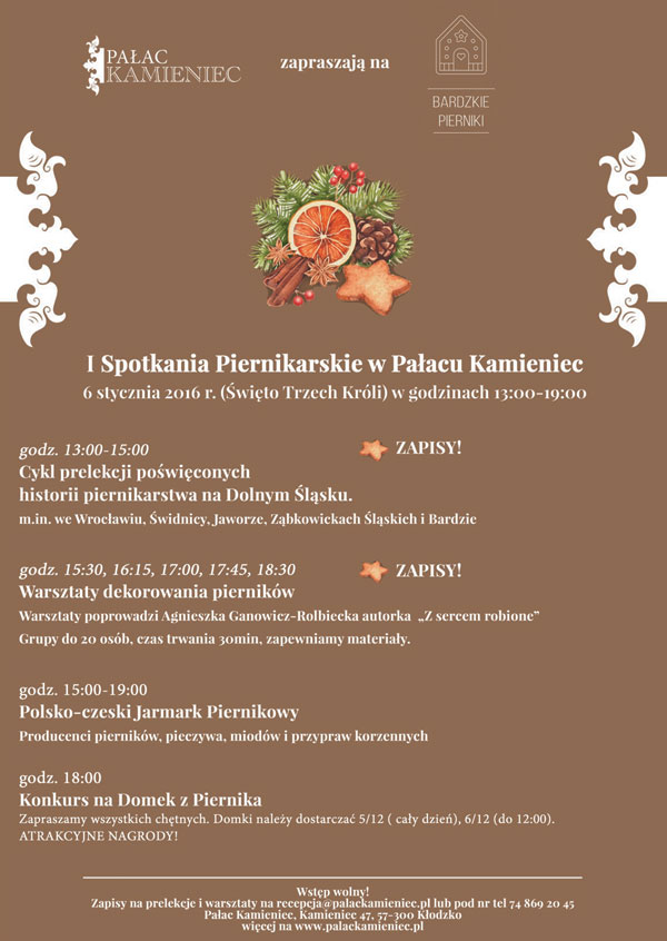 Pałac Kamieniec zaprasza na I Spotkania Piernikarskie w Pałacu Kamieniec, które odbędą się w dniu 6 stycznia 2016 r. (w Święto Trzech Króli), w godzinach 15:00 - 19:00. W programie planowane są prelekcje poświecone historii piernikarstwa na Dolnym Śląsku, warsztaty dekorowania pierników, polsko-czeski Jarmark Piernikowy oraz różnorakie konkursy z nagrodami.