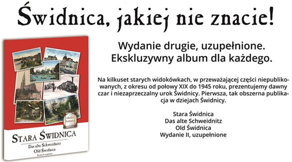 Świdnica, jakiej nie znacie! Drugie, poprawione wydanie albumu "Stara Świdnica"! Ekskluzywny album dla każdego. Na kilkuset starych widokówkach, w przeważającej części niepublikowanych, z okresu od połowy XIX do 1945 roku, zaprezentowany został dawny czar i niezaprzeczalny urok Świdnicy. Pierwsza, tak obszerna publikacja w dziejach Świdnicy.