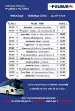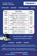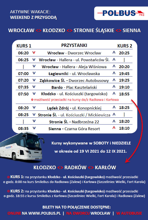 Druga propozycja to dwie trasy w kierunku ziemi kłodzkiej realizowane w soboty i niedziele w okresie od 19 czerwca do 12 września 2021 r. Z Wrocławia do Stronia Śląskiego przez Bardo, Kłodzko, Lądek-Zdrój autobusy będą startowały o godz. 6:20. Z kolei z Wrocławia do Złotego Stoku przez Wojsławice, Przerzeczyn-Zdrój, Srebrną Górę autobusy będą startowały o godz. 8:30.