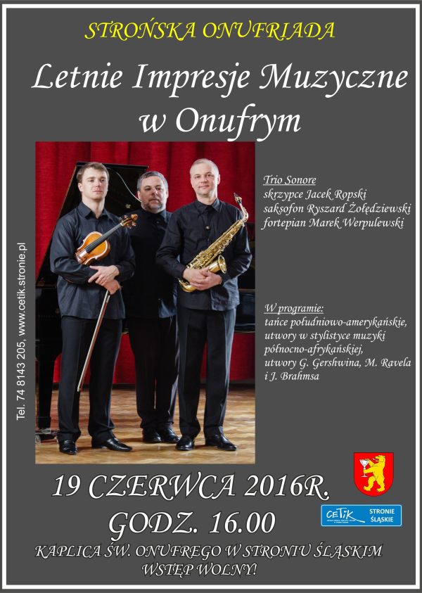 19 czerwca 2016 r. (niedziela) o godz. 16:00 w ramach cyklu "STROŃSKA ONUFRIADA" zapraszamy do Kaplicy św. Onufrego na koncert zespołu Trio Sonore w wykonaniu: skrzypce, Jacek Ropski, saksofon, Ryszard Żołędziewski, fortepian, Marek Werpulewski W programie: tańce południowo-amerykańskie, utwory w stylistyce muzyki północno-afrykańskiej, oraz utwory G. Gershwina, M. Ravela i J. Brahmsa. Wstęp wolny!