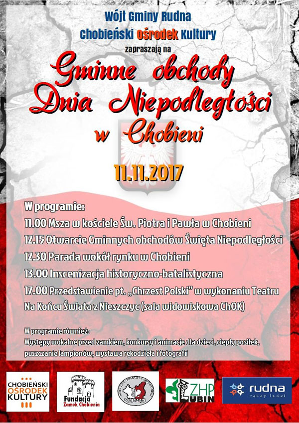 Jak co roku pragniemy zaprosić wszystkich chętnych do uczestnictwa w obchodach Narodowego Święta Niepodległości w Chobieni. Tradycyjnie - na terenie chobieńskiego zamku – odbędzie się widowisko batalistyczno-historyczne, tym razem swą tematyką zahaczające o lata 1918-1919. Widowisko zorganizowane zostanie przy udziale rekonstruktorów militarnych oraz statystów.