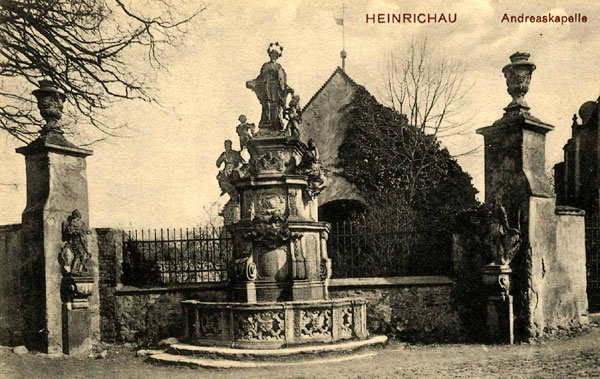 W Henrykowie nasycenie wizerunkami św. Jana Nepomucena osiągnęło zenit. Na terenie tej miejscowości można wskazać aż cztery wizerunki tego świętego, w większości za sprawą słynnego klasztoru cystersów. Pierwszy i najbardziej okazały pomnik św. Jana znajduje się przy biegnącej przez wieś drodze, w murze otaczającym kościółek św. Andrzeja. Ten dużych rozmiarów, późnobarokowy pomnik powstał w 1730 roku za sprawą opata henrykowskiego Georgiusa Regnarda (1725-1732). Postać świętego ustawiono została na rozbudowanym postumencie, na froncie którego widnieje scena spowiedzi królowej Zofii. Świętego Jana adorują aniołowie, którzy trzymają w dłoniach jego atrybuty: zamkniętą kłódkę i klucz. Samego świętego w lekkim kontrapoście przedstawiono tradycyjnie w stroju kanonika, z biretem w dłoni i wieńcem z gwiazd nad głową.