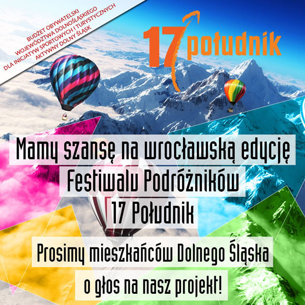 Po czterech latach istnienia Festiwalu, w czasie których stał się on ważnym punktem na mapie „podróży po podróżach”, mamy wreszcie szansę na zorganizowanie jego wrocławskiej edycji, o której od dawna już myślimy, i o którą Wy wielokrotnie się dopytywaliście. Nasz projekt właśnie został zakwalifikowany do programu Urzędu Marszałkowskiego Województwa Dolnośląskiego „Aktywny Dolny Śląsk” i walczy o finansowe wsparcie z budżetu obywatelskiego. O dofinansowaniu zadecyduje internetowe głosowanie. Wsparcie otrzymają 3 zwycięskie projekty w każdym z pięciu okręgów, na który podzielony został Dolny Śląsk - nasz projekt znajduje się w okręgu – Wrocław pod nr 92.
