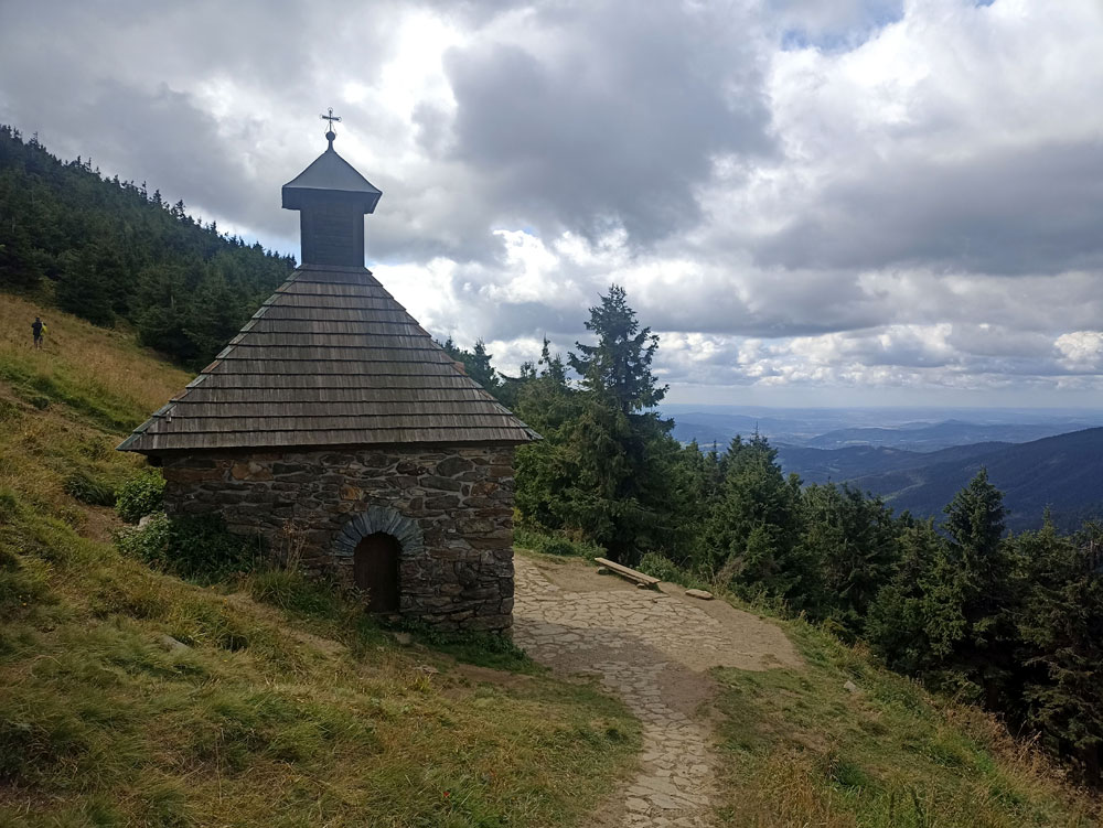 Z przystanku autobusowego ruszamy najpierw za znakami szlaku żółtego i zaraz potem czerwonego, mijając po drodze chatę Červenohorské Sedlo, która już od wczesnych godzin ma czynny bufet, więc to dobre miejsce na śniadanie. Czeka nas dość długie, bo czterokilometrowe, na szczęście dość łagodne podejście do Vřesovej studánki. Po drodze w kilku miejscach rozpościerają się ładne widoki, warto też zatrzymać się na chwilę przy kapliczce, upamiętniającej ofiary gór.