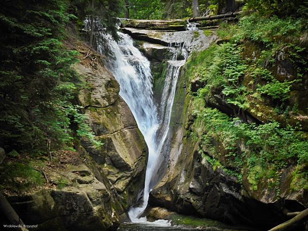 Co do wysokości Wodospadu Szklarki istnieją spore rozbieżności, dlatego przedstawię różne poglądy na ten temat: T. Grieben (1860 r.) – 47 stóp pruskich czyli 14,75 m, W. Dressler (1915 r.) – 14 m, SGTS (1993 r.) – 13,3 m, A. Otto (1910 r.), S. Beck (1913 r.), Griebens Reiseführer (1927 r.) – 13,18 m, Encyclopedia Corcontica (2003 r.) – ponad 13 m, Słownik Geograficzno-Krajoznawczy Polski (1992 r.), P. Migoń (1994 r.), S. Adamczak (2003 r.) – 13 m, D. Letzner (1898 r.), W. Patschovsky (1918 r.), Meyers Reisebücher (1935 r.),T. Steć (1962 r.) – 10,6 m, M. Terlak (1966 r.) – 10 m, Mapa GGK M-33-44-C-a-1 (1998 r.) – 9 m. Bardzo proszę P.T. Czytelnika, aby wybrał sobie to co lubi i nie pytał mnie co ja lubię! Charakterystyczne jest jednak to, że żaden z autorów nie wypowiada się w jaki sposób zmierzono wysokość wodospadu: od górnego poziomu wody do poziomu wody w kotle eworsyjnym, czy od górnego progu do dna skał. A teraz wracamy na prawy brzeg Szklarki, ale poniżej wodospadu, udając się w kierunku ujścia Szklarki. W odległości niecałych 100 m od wodospadu szeroki Szklarski Mostek przeprawia na drugą prawą stronę potoku. W odległości 50 m od niego ciekawa skała Oblicze Karkonosza, którą Niemcy nazywali po prostu Rübezahl. Ze środka skały wyziera ludzka twarz. Kilkadziesiąt metrów od Oblicza Karkonosza wyrasta trochę wyżej okazała skała dla której proponuję nazwę Kochaniec, a znacznie dalej, mniejsza skałka Kochelna. Od niej blisko do dwóch skałek na wschodnim narożniku wądołu, które nazywają się Kochelki (Kochel Steine). Pod Kochelkami ostatni na Szklarce Wądolny Mostek przed jej ujściem do Kamiennej.