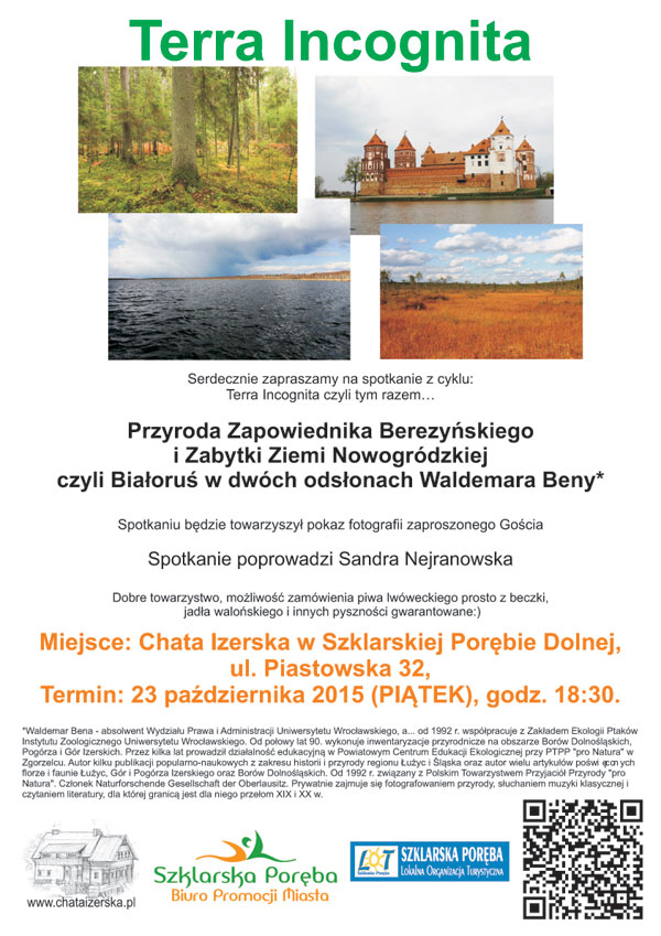 Chata Izerska zaprasza na spotkanie z cyklu: Terra Incognita czyli tym razem… „Przyroda Zapowiednika Berezyńskiego i Zabytki Ziemi Nowogródzkiej czyli Białoruś w dwóch odsłonach Waldemara Beny”. Spotkaniu będzie towarzyszył pokaz fotografii zaproszonego Gościa. Spotkanie poprowadzi Sandra Nejranowska.