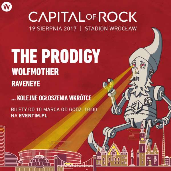 Headlinerem wydarzenia będą legendarni The Prodigy, którzy zawitają ze swoim potężnym, energetycznym show. Współorganizatorem koncertu Capital of Rock jest Wrocław 2016 Europejska Stolica Kultury. Bilety do sprzedaży trafią 10 marca i będzie je można kupować za pośrednictwem serwisu eventim oraz w stacjonarnych punktach sprzedaży
