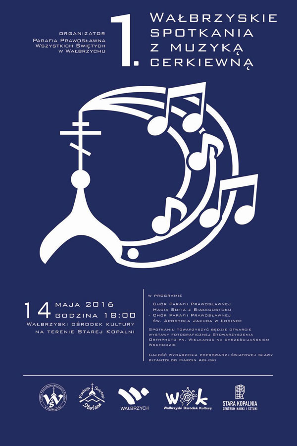 14 maja o godz.18.00 w Wałbrzyskim Ośrodku Kultury na terenie Starej Kopalni odbędą się wałbrzyskie Spotkania z Muzyką Cerkiewną. To pierwsze takie przedsięwzięcie propagujące muzykę cerkiewną na Dolnym Śląsku. Usłyszymy dwa znakomite chóry: parafialny Cerkwi pw. Mądrości Bożej Hagia Sophia z Białegostoku oraz „Harmoń” Cerkwi pw. Św. Apostoła Jakuba z Łosinki. Jednocześnie zapraszamy także na otwarcie wystawy pt. "Tradycje Wielkanocne Chrześcijańskiego Wschodu”. Wałbrzyskie Spotkania z Muzyką Cerkiewną będą niewątpliwie znaczącym wydarzeniem kulturalnym na Dolnym Śląsku.