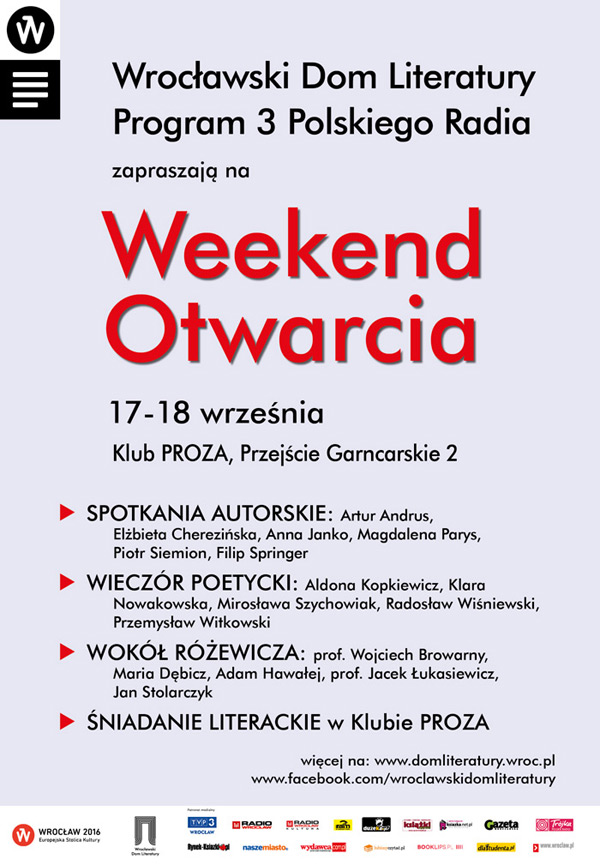 Program Weekendu Otwarcia został przygotowany we współpracy z Radiową Trójką. Odbędzie się cykl spotkań autorskich poprowadzonych m.in.: przez redaktora Michała Nogasia (Radiowa Trójka) oraz prof. Stanisława Beresia. Będzie to okazja do rozmów o książkach już znanych, ale i premierach z: Arturem Andrusem, Elżbietą Cherezińską, Anną Janko, Magdaleną Parys, Filipem Springerem, czy Piotrem Siemionem. W programie znajdą się ważne wrocławskie akcenty takie jak dyskusja Wokół Różewicza, wystawa fotografii Adama Hawałeja oraz wieczór poetycki (dolnośląscy poeci i poetki: Aldona Kopkiewicz, Klara Nowakowska, Mirosława Szychowiak, Radosaw Wiśniewski, Przemysław Witkowski). W sobotę warto wybrać się do klubu PROZA na wyjątkowe śniadanie literackie z menu inspirowanym powieściami.