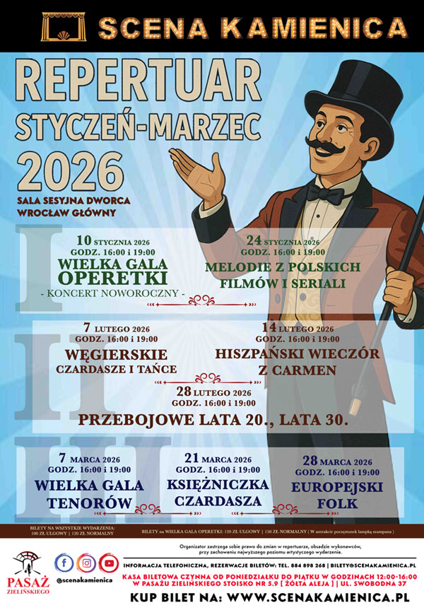 Teatr Scena Kamienica zaprasza na Wielki Karnawał – wyjątkową prezentację repertuaru artystycznego zaplanowanego na miesiące styczeń–marzec 2026. To czas wypełniony operetką, muzyką filmową, tańcem, folklorem Europy oraz wielkimi głosami solistów związanych z najważniejszymi scenami muzycznymi. Wszystkie wydarzenia odbędą się w reprezentacyjnej przestrzeni Sali Sesyjnej Dworca Wrocław Główny, która na kilka zimowych i wiosennych tygodni stanie się centrum muzycznego życia miasta.