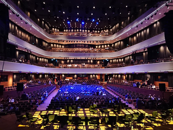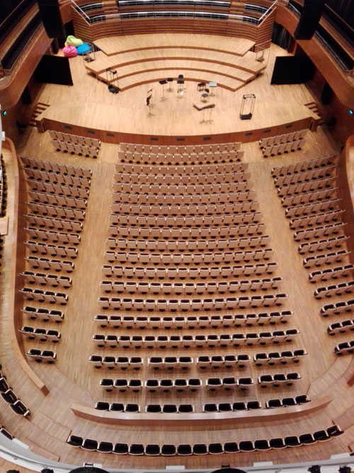 Widok z ostatniego balkonu NFM. Kształt sali głównej przywodzi na myśl pudło rezonansowe skrzypiec lub altówki