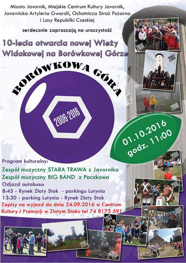 Miasto Javornik, Miejskie Centrum Kultury Javornik, Javornicka Artyleria Gwardii, Ochotnicza Straż Pożarna i Lasy Republiki Czeskiej zapraszają w dniu 1 października na uroczystość 10-lecia otwarcia nowej Wieży Widokowej na Borówkowej Górze. W programie imprezy: zespół muzyczny Stara Trawa z Javornika, zespół muzyczny Big Band z Paczkowa.