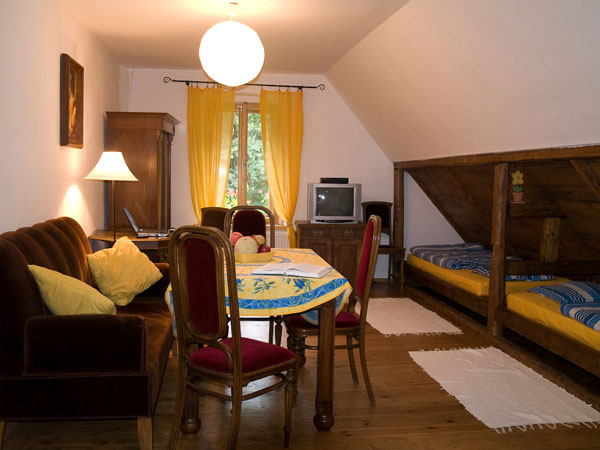 Na parterze budynku znajduje się apartament SALON, o powierzchni ok. 60 m2, przeznaczony dla 2-3 osób, składający się z trzech pomieszczeń: dużego salonu z kominkiem (stylowe meble, dwie kanapy, gramofon), sypialni z łóżkiem małżeńskim, garderoby z aneksem kuchennym oraz łazienki. Na pierwszym piętrze jest apartamentBABCIA, o powierzchni ok. 50 m2, przeznaczony dla 4-5 osób i składający się z pokoju dziennego w stylu rustykalnym z ławą i łóżkiem małżeńskim oraz sypialni, w której są dwa łóżka (istnieje możliwość dostawki), aneksu kuchennego oraz łazienki z wanną narożną, kabiną prysznicową, toaletą i dwoma umywalkami. Na pierwszym piętrze znajduje się także apartament KUKA (60 m2, 3 pokoje dla w sumie 6-7 osób) z pokojem dziennym w stylu rustykalnym z dwoma łóżkami i kanapą, dwoma pokojami sypialnymi, również w stylu rustykalnym, każdy z łóżkiem małżeńskim, aneksem kuchennym oraz łazienką z toaletą i kabiną prysznicową. Czwarty apartament znajduje się również na pierwszym piętrze i nazwaliśmy go STUDIO 2. Ma powierzchnię ok. 25 m2 i składa się z pokoju przeznaczonego dla 2-3 osób oraz pokoju dziennego, aneksu kuchennego wyposażonego w mikrofalówkę, lodówkę, zmywarkę i elektryczną kuchenkę oraz łazienki z toaletą i natryskiem.