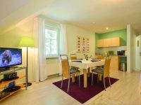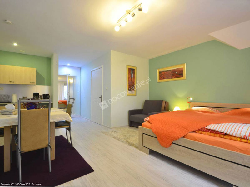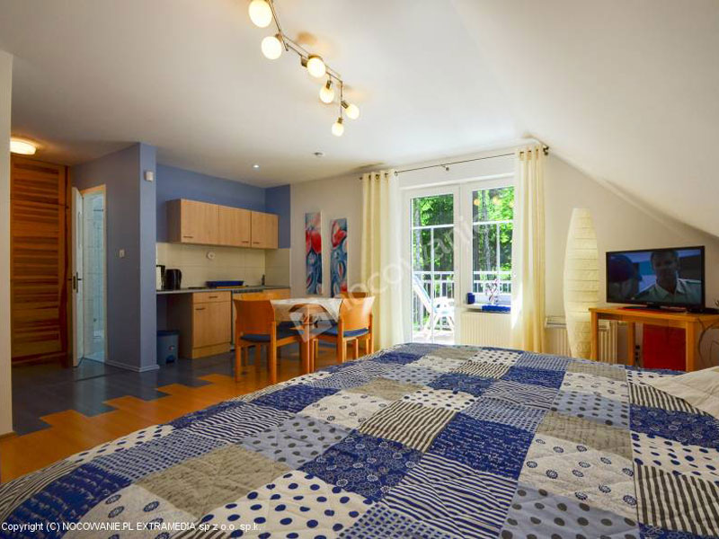 APARTAMENT ZIELONY: 2 lub 3-osobowy o pow. ok. 34 m², bardzo komfortowy, składający się z jednego pokoju z łożem małżeńskim oraz rozkładanej sofki, przedpokoju, łazienki wyposażonej w kabinę prysznicową, kuchni oraz dużego balkonu (ok. 5 m). Aneks kuchenny wyposażony jest we wszystkie niezbędne do przygotowania posiłków elementy. Do Państwa dyspozycji jest balkon z kompletem wypoczynkowym i stolikiem gdzie wieczorem możecie rozkoszować się filiżanką kawy. Cena apartamentu uzależniona jest od ilości osób