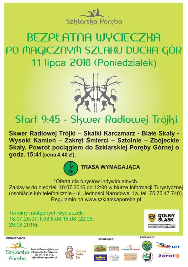 Szklarska Poręba zaprasza na bezpłatną wycieczkę po Magicznym Szlaku Ducha Gór, która odbędzie się za tydzień, w poniedziałek, 11 lipca 2016 r. Tym razem uczestnicy cyklicznej wycieczki udadzą się w towarzystwie przewodnika (spotkanie o 9:45 na Skwerze Radiowej Trójki) pod Białe Skały, a następnie na Wysoki Kamień, Zakręt Śmierci, do starych sztolni i na Zbójeckie Skały. Powrót pociągiem do Szklarskiej Poręby Górnej o godz. 15:41. Trasa średnia, czas przejścia ok. 6 h. Oferta skierowana jest do turystów indywidualnych. Zapisy do niedzieli, 10 lipca, w biurze Informacji Turystycznej (osobiście lub telefonicznie - ul. Jedności Narodowej 1a, tel. 75 75 47 740).